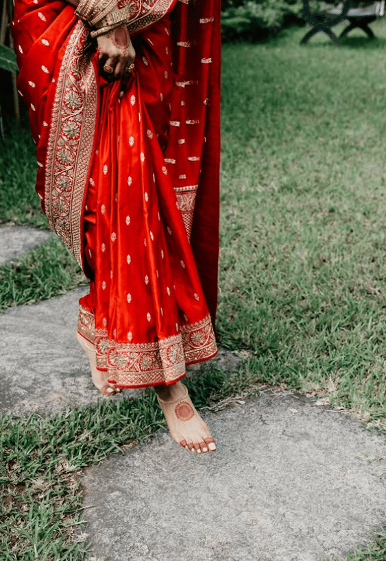 नई तस्वीरों में सामंथा का ब्राइडल लुक भी साफ़ दिखाई दे रहा है। उन्होंने लाल रंग की पारंपरिक साड़ी पहनी थी, जिसमें गोल्डन मोटिफ्स और कढ़ाई वाले बॉर्डर थे। यह खूबसूरत साड़ी अर्पिता मेहता द्वारा डिज़ाइन की गई थी और हाथ से बुनी हुई थी। सामंथा ने इस साड़ी को मैचिंग ब्लाउज़ के साथ पहना था, जिसमें गोल्ड का बारीक डिज़ाइन था। साड़ी को तैयार करने में 2-3 हफ़्ते का समय लगा था।