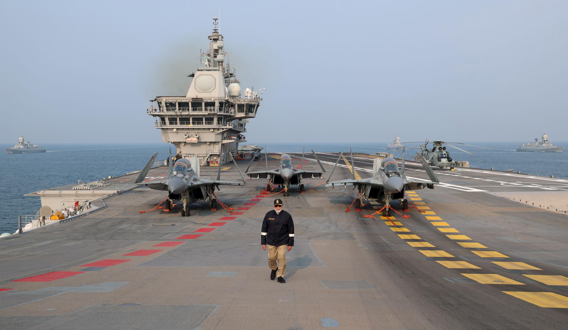 आईएनएस विक्रांत पर सवार होने के बाद प्रधानमंत्री ‘फ्लाइटडेक’ पर गए, जहां उनके चारों ओर मिग 29के लड़ाकू विमान तैनात थे.