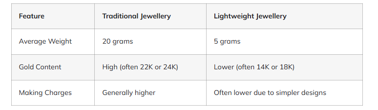 हल्के आभूषणों की कीमत पारंपरिक आभूषणों से कम होती है. इनमें कम सोना इस्तेमाल होता है, जिससे ये सस्ते होते हैं. उदाहरण के लिए, एक पारंपरिक सोने के हार का वजन लगभग 20 ग्राम होता है. एक हल्के आभूषण का वजन केवल 5 ग्राम हो सकता है, जिससे पैसे की बचत होती है.