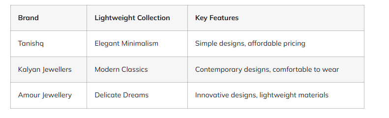 नए ब्रांड उभर रहे हैं, जो केवल हल्के आभूषणों पर ध्यान केंद्रित कर रहे हैं. वे स्टाइलिश और किफायती आभूषण प्रदान करने के लिए नए डिज़ाइन और बनाने के तरीकों का उपयोग करते हैं. अमोर ज्वैलरी एक ऐसा ब्रांड है जो अपने आधुनिक और नाजुक डिज़ाइनों के लिए जाना जाता है.