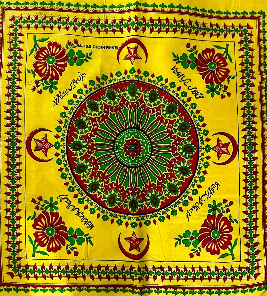 इसके अलावा कपड़े पर चारों तरफ उर्दू/अरबी में कुछ धार्मिक शब्द या दुआएँ लिखी हुई दिखाई देती हैं। लिखावट सजावटी अंदाज़ में है, इसलिए पूरी तरह साफ़ पढ़ना मुश्किल है, लेकिन आमतौर पर ऐसे दस्तरख़ानों पर ये शब्द लिखे होते हैं: