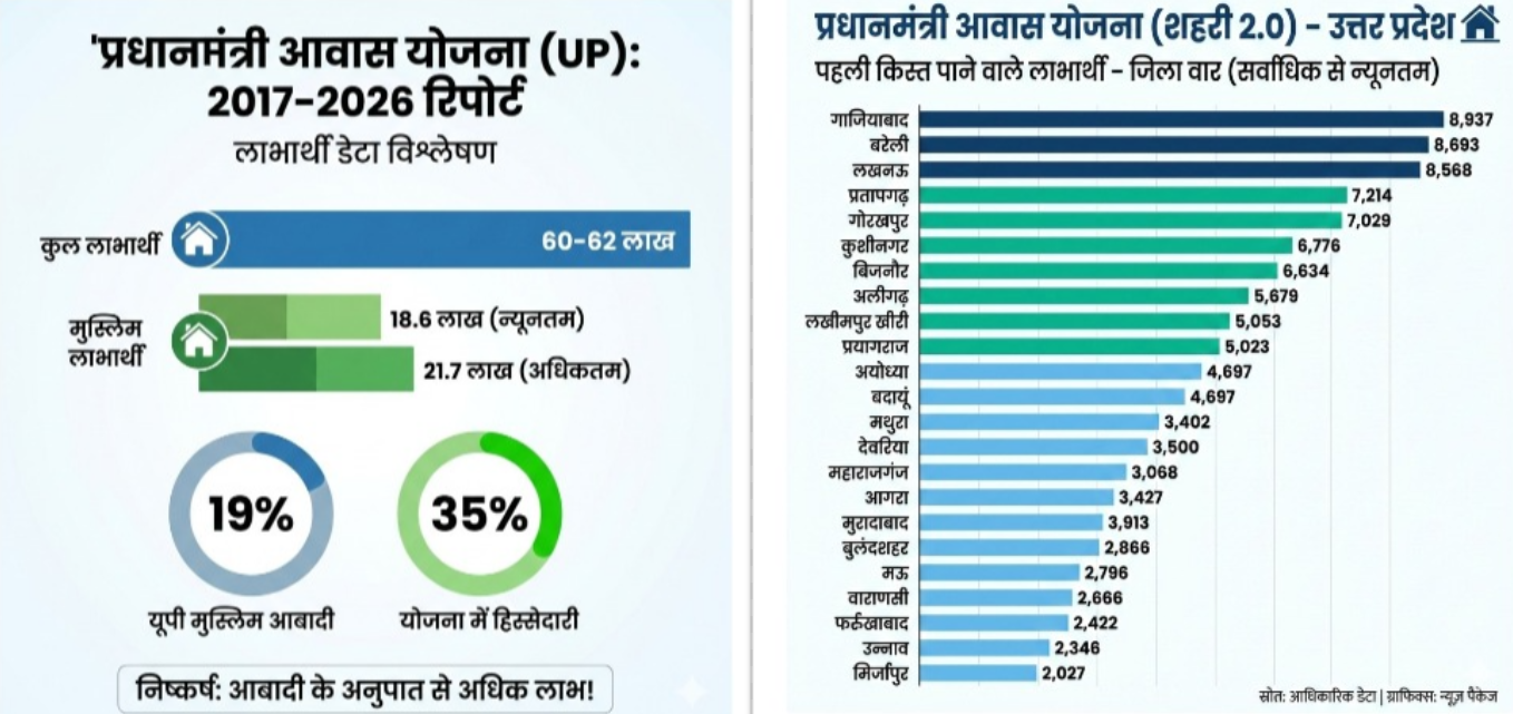 सरकारी आंकड़ों के अनुसार, मार्च 2017 से जनवरी 2026 तक के करीब साढ़े आठ वर्षों में उत्तर प्रदेश में प्रधानमंत्री आवास योजना (ग्रामीण और शहरी दोनों) के तहत लगभग 60 से 62 लाख परिवारों को पक्के आवास उपलब्ध कराए गए हैं। मुख्यमंत्री योगी आदित्यनाथ का सार्वजनिक दावा है कि इनमें से करीब 21 लाख आवास मुस्लिम परिवारों को मिले हैं। भले ही आधिकारिक रूप से धर्म-आधारित ब्रेकअप उपलब्ध न हो, लेकिन मुख्यमंत्री के इस बयान के आधार पर यदि विश्लेषण किया जाए तो योजना में मुस्लिम लाभार्थियों की हिस्सेदारी 30 से 35 प्रतिशत के बीच बैठती है। यह आंकड़ा इसलिए भी अहम है क्योंकि उत्तर प्रदेश की कुल जनसंख्या में मुस्लिम समुदाय की हिस्सेदारी लगभग 18 से 19 प्रतिशत है।