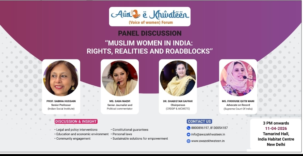 नई दिल्ली के इंडिया हैबिटेट सेंटर में ‘आवाज़-ए-ख़वातीन’ (एनजीओ) द्वारा आयोजित पैनल चर्चा “भारत में मुस्लिम महिलाएं: अधिकार, वास्तविकताएं और चुनौतियां” केवल एक औपचारिक संवाद नहीं, बल्कि जमीनी हकीकत, सामाजिक सोच, कानून और पहचान के बहुआयामी पहलुओं पर गहन मंथन का मंच बनकर उभरी। इस चर्चा में यह स्पष्ट हुआ कि मुस्लिम महिलाओं की स्थिति को समझने के लिए केवल नीतियों या धार्मिक दृष्टिकोण से नहीं, बल्कि इतिहास, समाज, साहित्य और वर्तमान वास्तविकताओं को साथ लेकर देखने की आवश्यकता है।