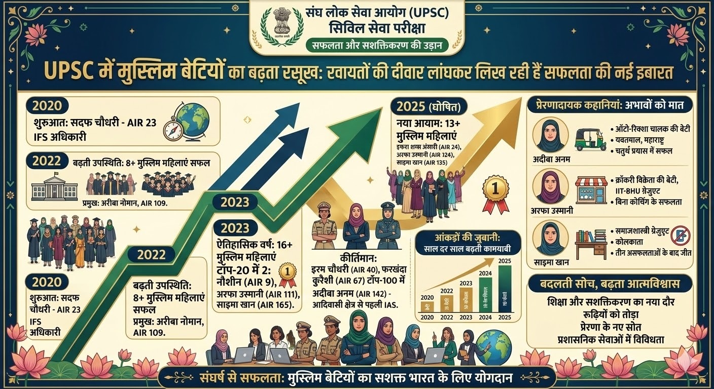 यूपीएससी में मुस्लिम उम्मीदवारों, खासकर महिलाओं का बढ़ता प्रतिनिधित्व एक बड़े सामाजिक बदलाव का संकेत है। साल 2020 में जहां सदफ चौधरी ने 23वीं रैंक के साथ मुस्लिम उम्मीदवारों में टॉप किया था, वहीं 2023 और 2024 में यह संख्या और बढ़ी। साल 2025 की घोषणा में भी लगभग 13 से अधिक मुस्लिम महिलाएं सफल रहीं। इरम चौधरी (AIR 40) और फरखंदा कुरैशी (AIR 67) जैसे नाम अब समाज में रोल मॉडल बन चुके हैं।